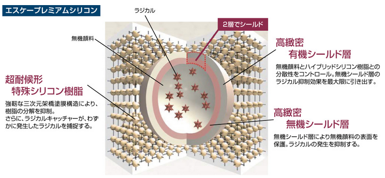 エスケープレミアムシリコンには「ラジカルを封じ込める成分」が配合されています。紫外線を受けてもラジカルが広がらないようにコントロールしてくれるので、塗膜の劣化スピードがグッと遅くなるんです。