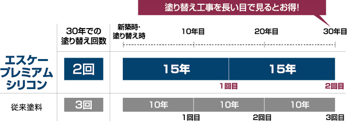 一般的なシリコン塗料が8~10年程度に対して、エスケープレミアムシリコンは12~15年。