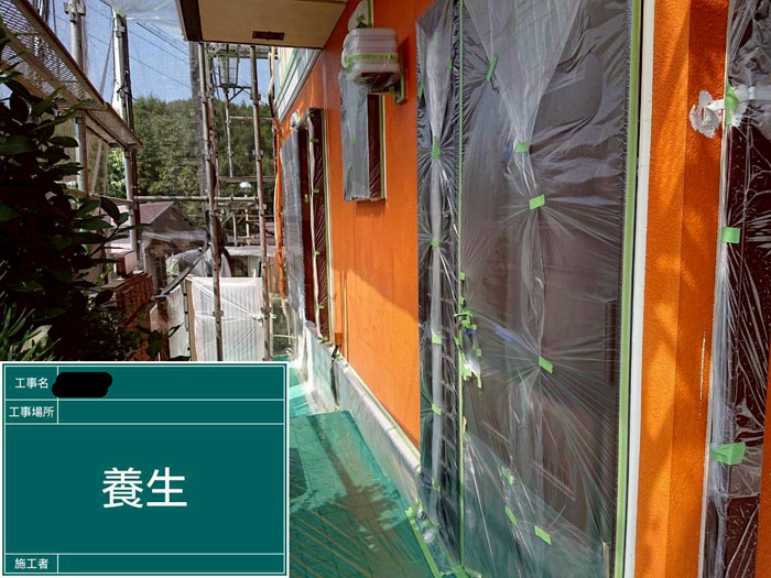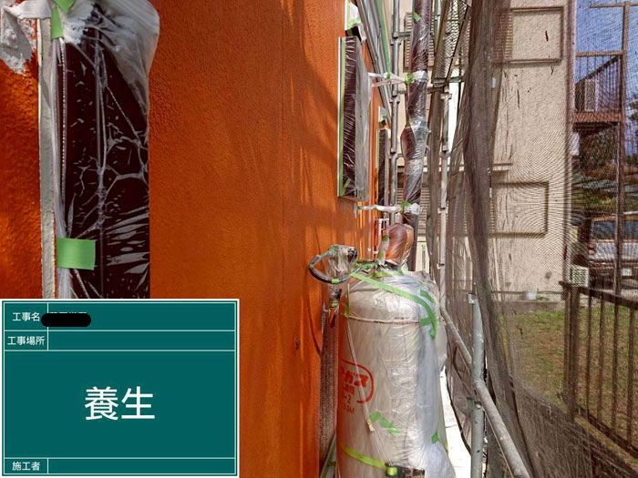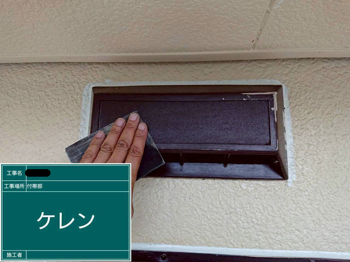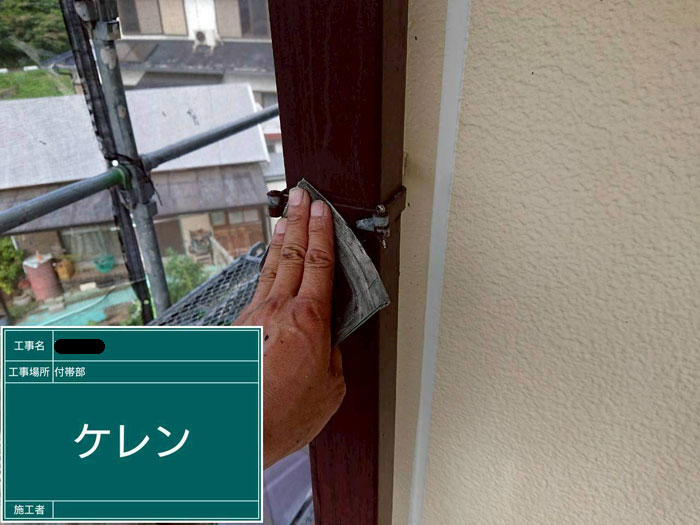 本日の作業は奈良市都祁馬場町で付帯部塗装前に行いますケレン(汚れ落とし)と鉄部の錆止め、養生を行いました。