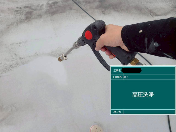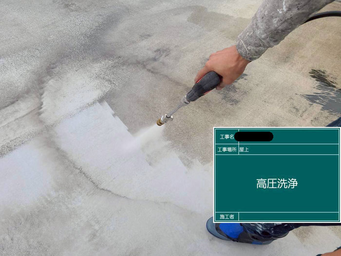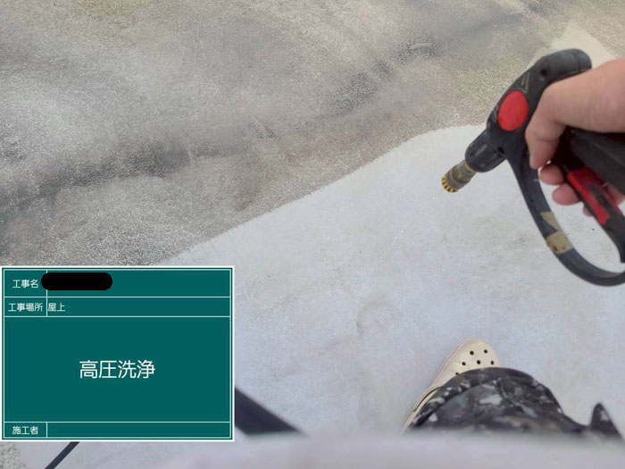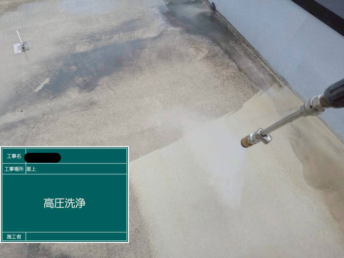 本日の作業は、大阪府門真市で陸屋根のFRPトップコート前の高圧洗浄をしました。