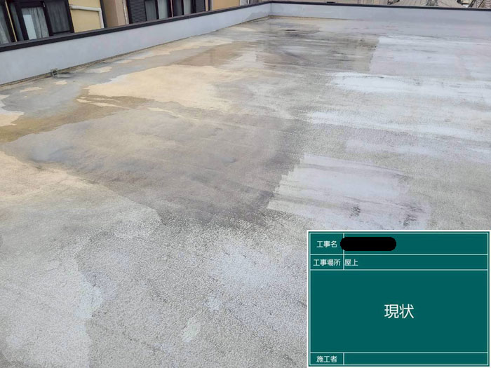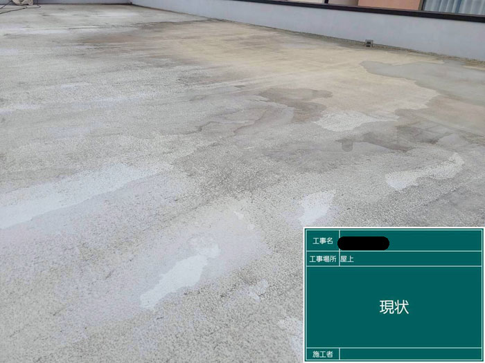 とくにアパート・ビルの屋上は人の行き来で靴底の油膜がついていることがあります。目に見えない油膜が密着不良の大きな原因にもなります。